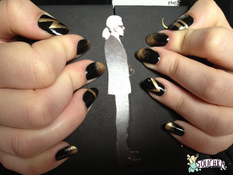 J'ai reçu plein de vernis comme cadeaux de Noël (sans rire !), et ce coffret de vernis signé Karl Lagerfeld en faisait partie. Il contient un vernis doré et un noir. Ce sont des couleurs que je ne porte absolument pas en vernis à ongles, mais je trouve que leur mariage a un rendu très élégant !