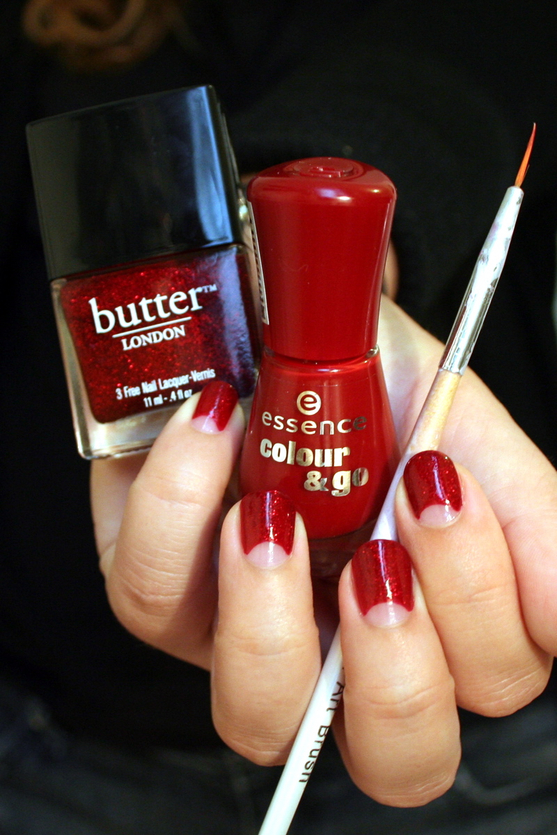 Nous en sommes donc au jour 1 : red nails. On commence easy, avec un grand classique. Ça me rappelle ce sentiment de joie intense lorsque tu vois débarquer un sujet d'examen pile poil sur le thème que tu as révisé... J'avais l'idée d'une manucure rouge avec des demi-lunes nues depuis Noël dernier, mais je ne l'avais jamais mise en œuvre. Et pourtant, je savais exactement que je voulais utiliser mon vernis rouge à paillettes préféré de toute la Terre : Chancer, de Butter London. Mais bon, c'était moins drôle que de dessiner des ananas sur mes ongles, alors j'avais un peu laissé tomber.