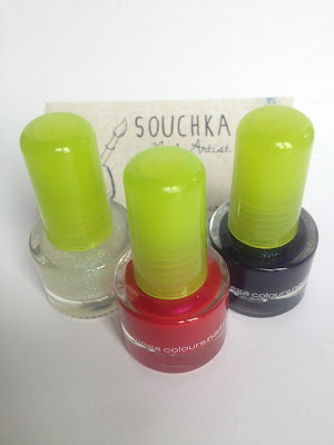 Le lot est composé de trois vernis 2b Cosmétics : un très joli top coat à paillettes blanches irisées, il me fait penser à de la poussière de fée, un vernis rose fushia, avec un shimmer rose super girly, et enfin un magnifique bleu nuit, plein de micro paillettes bleues et de reflets argentés.