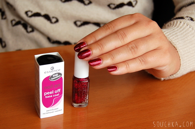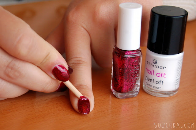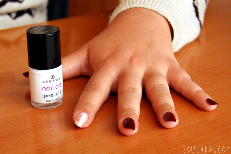 Fatiguée d'avoir les cuticules abîmées par la pose de dissolvant en papillote, j'ai décidé d'essayer la base peel-off de la marque Essence, gentiment ramenée de Germanie par ma blopine Selma (thelittleblackcase.com).