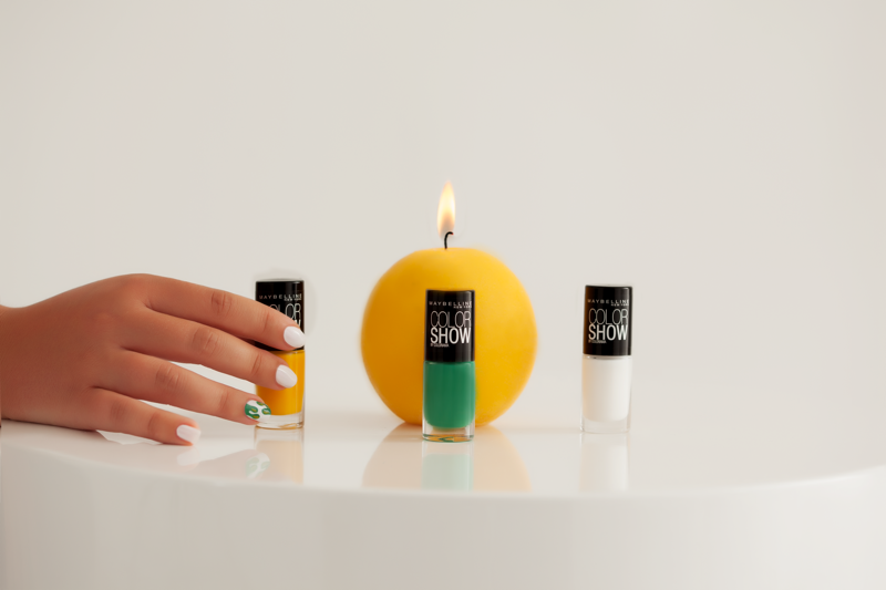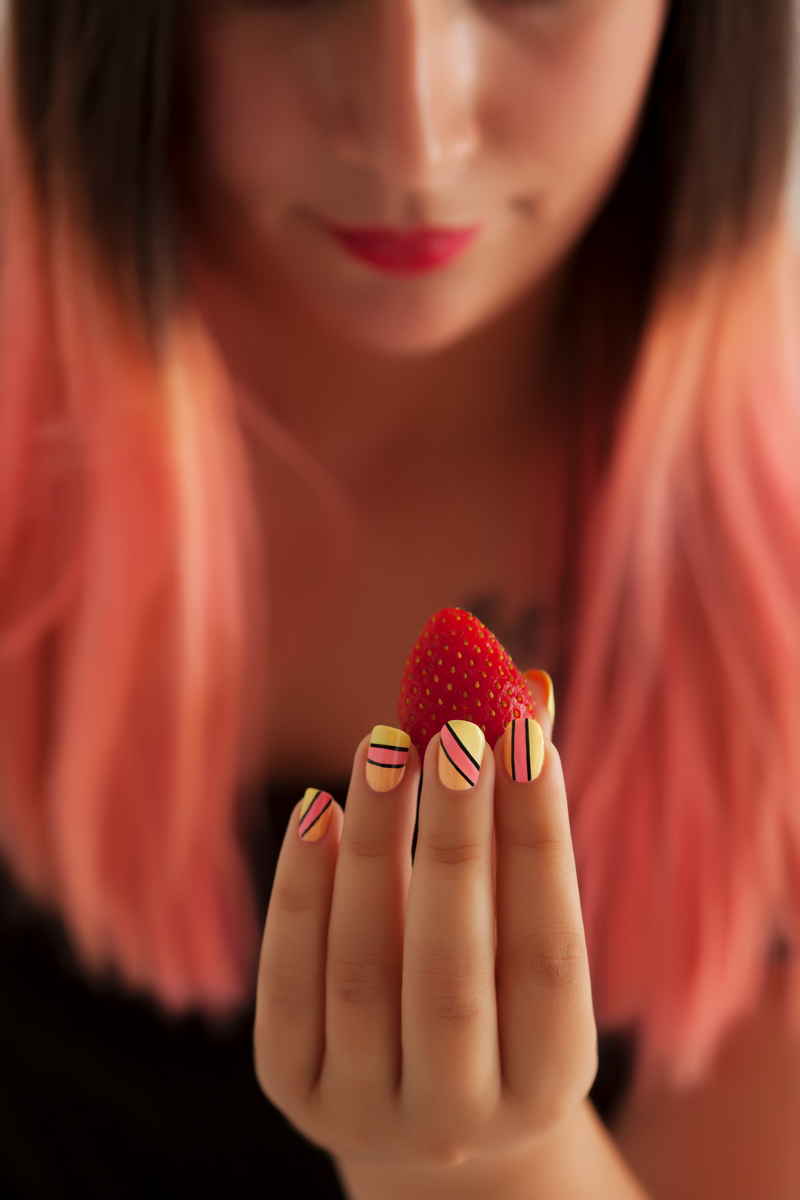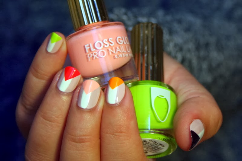 Les 3 vernis neon Fastlane (rouge), Neon Nacho (orange) et Con Limon (vert) ont une texture jelly, que j'apprécie énormément mais qui n'est pas très pratique pour le nail art du fait de son manque d'opacité. Ils seront parfaits en base de nail art, ou utilisés sur des bases de couleur claire ! Au début, j'avais réalisé cette même manucure en utilisant Partybruise en base à la place de Dinge, et on voyait clairement au travers de mes triangles neon la démarcation entre Glowstar et Partybruise. On la voit encore un tout petit peu avec la version plus claire de cette manucure, mais il faut vraiment avoir le nez dessus pour le remarquer.